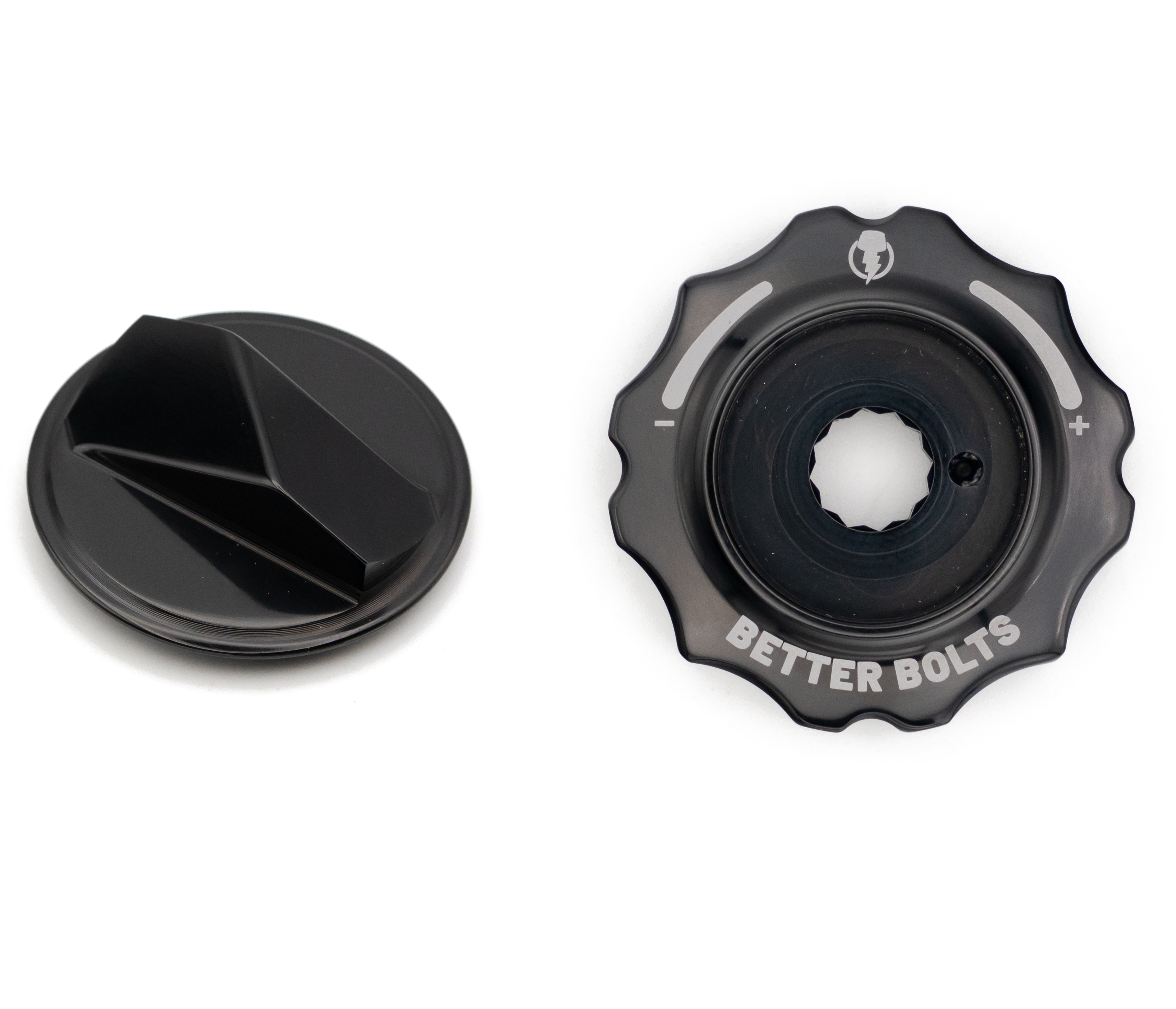 Better Bolts HSC Dial Top Cap und Air Cap passend zu den Fox 36/38/40 Grip 2/Grip X2/Grip X Federgabeln. Wir haben diese Kappen nicht nur entwickelt, um dem Fahrer mehr Möglichkeiten zu geben, das Fahrrad individuell anzupassen, sondern auch, um zusätzliche Funktionalität zu bieten. Die Abdeckung auf der Luftseite wurde speziell entwickelt, um das häufige Problem zu beheben, dass die Kappe beim Nachfüllen von Luft festsitzt. Der Daumenknopf ist so gestaltet, dass er sich nicht mit grossem Drehmoment anziehen lässt, bietet aber eine grosse Oberfläche für guten Halt, wenn der Fahrer die Kappe entfernt. Doch damit nicht genug: Der High-Speed-Compression-Drehknopf (HSC) wurde mit engeren Toleranzen neu gestaltet, was ein deutlich spürbareres Klicken beim Einstellen der Federung bietet und es dem Fahrer ermöglicht, die Einstellung seiner Gabel präziser vorzunehmen. Im Lieferumfang dabei sind auch die Federn sowie Kugeln für das HSC Dial Top Cap, sollten diese während der Montage verloren gehen, kannst du die serienmässigen Teile problemlos verwenden.