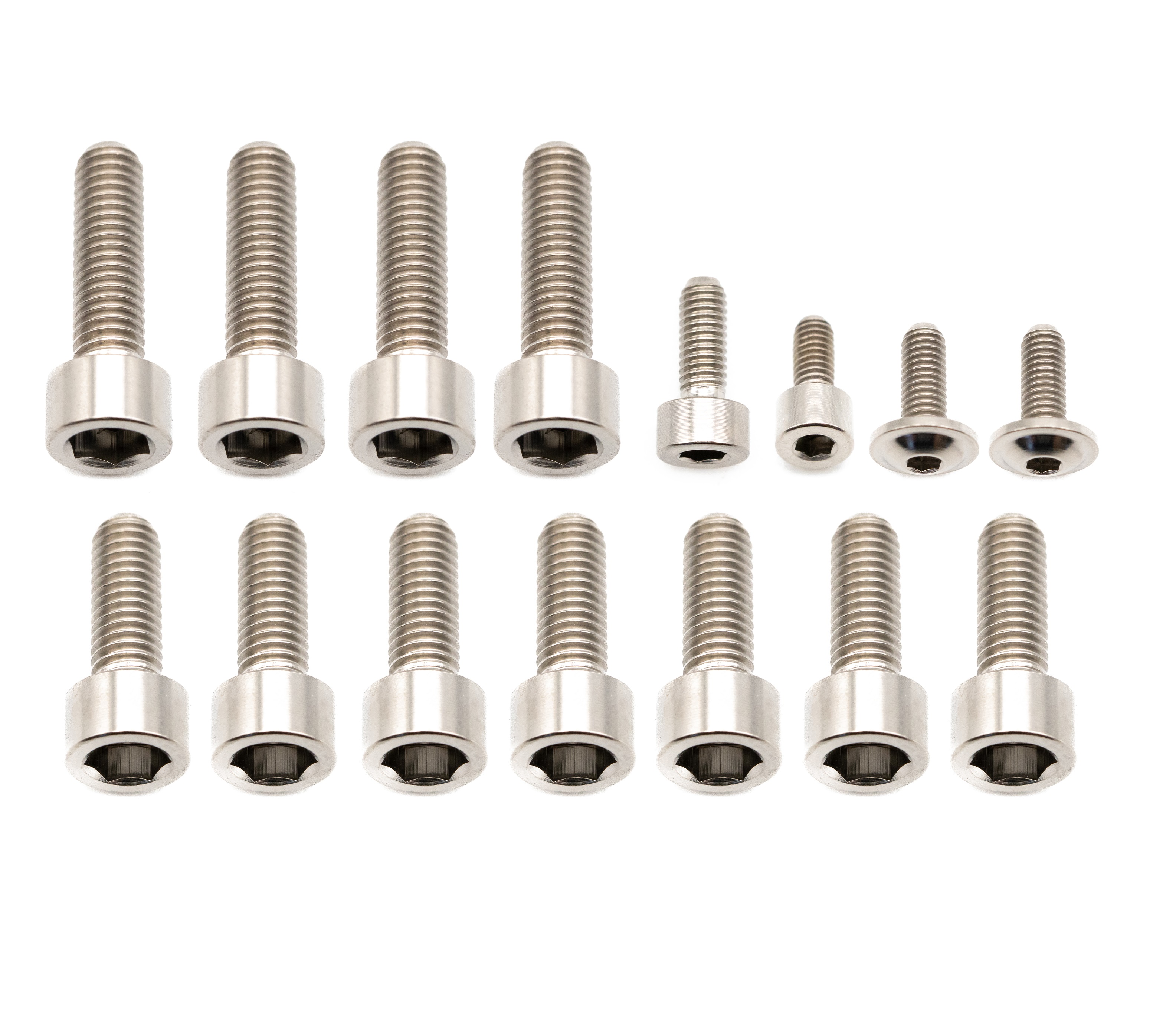 Better Bolts Titan Schrauben-Kit, passend für die Fox 40 Grip X2 Federgabel. Das Kit beinhaltet eine Schraube für die Befestigung der Bremsleitung M3 x 8mm, eine Schraube zur Fixierung des Druckstufen-Einstellhebels Grip SL M3 x 6mm, zwei Schrauben für die Mud Guard Schutzblechbefestigung, sechs Schrauben für die Befestigung der Gabelkrone M5 x 14mm, vier Schrauben für die Steckachsen-Klemmung am Gabel-Ausfallende M5 x 18mm.