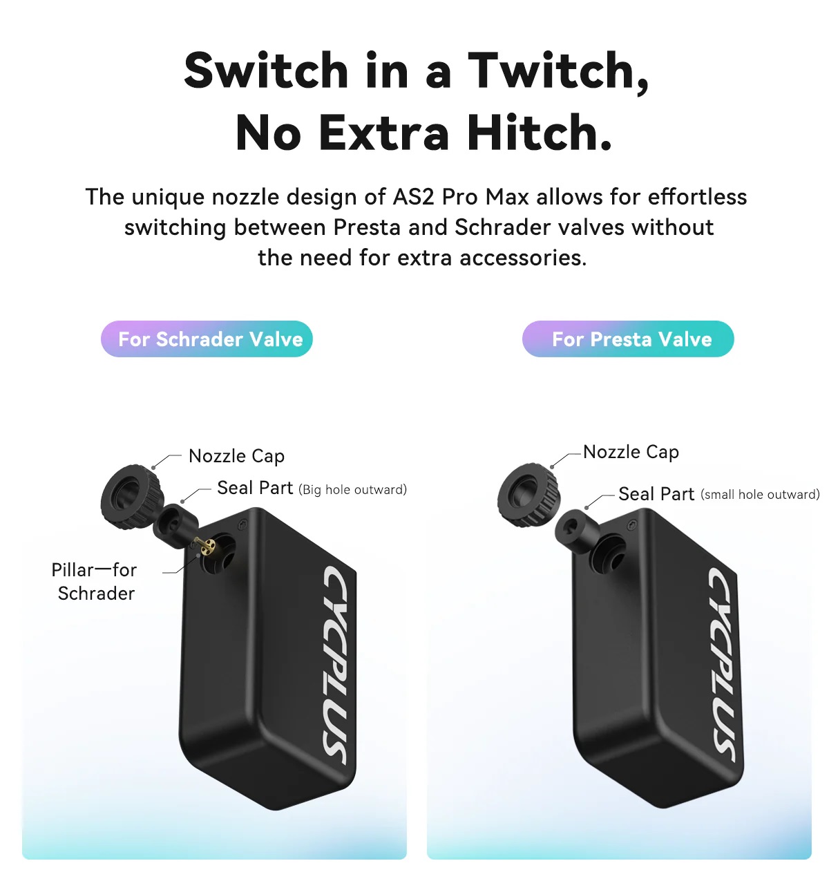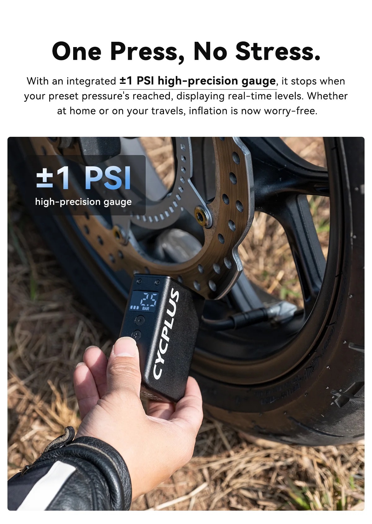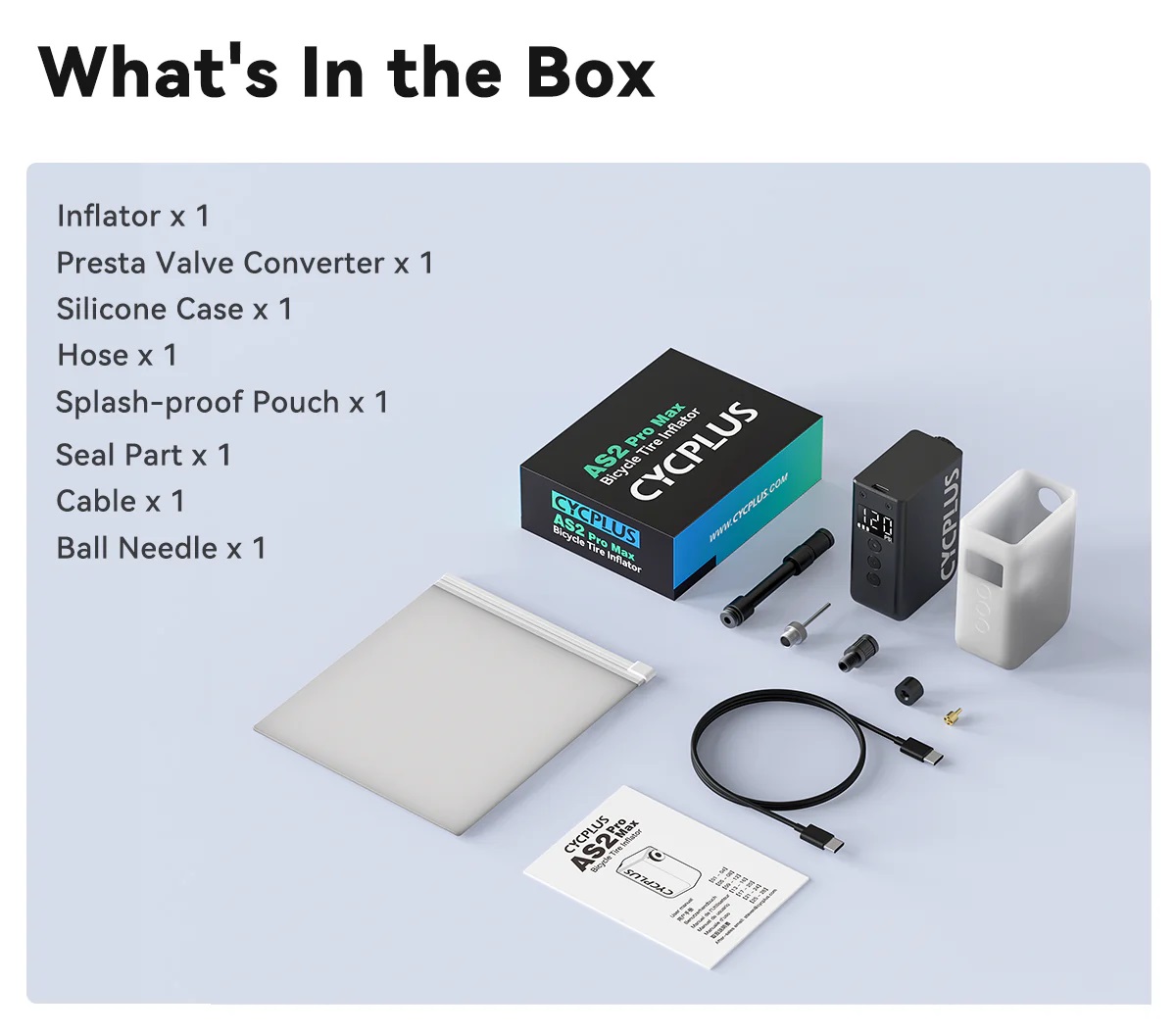 CYCPLUS ist ein wahrer Pionier der elektrischen Minipumpen. Die AS2 Pro Max wurde für anspruchsvollere Anwendungen entwickelt und eignet sich für höhere Volumen wie bei Mountainbikes mit sehr breiten Reifen und Motorräder. Dank dem superleichten und langlebigen Gehäuse aus einer hochfesten Aluminiumlegierung wiegt die AS2 Pro Max nur 205 g. Die patentierte CYCPLUS™-Designtechnologie und der hochentwickelte bürstenlose Motor garantieren ein schnelles Pumpen und hohe Drücke: 120 PSI (8.25 Bar) Maximal Druck in 75 Sekunden. Im übersichtlichen LED Display wir der Luftdruck in Echtzeit (auf 1 PSI genau), die einstellbaren Einheiten und die verbleibende Batterielebensdauer anzeigt. Mit dem integrierten 11.1V Akku lassen sich z.B. 29x2.2 Reifen sieben Mal mit 30 bis 50 PSI (2.0-3.5 Bar), 700x25 Reifen vier Mal mit 120 PSI (8.25 Bar) oder ein Motorradreifen 140/70-17 sieben Mal mit (2.0-2.5 Bar) aufpumpen. Der Akku lässt sich einfach über das mitgelieferte USB-C Kabel in nur 60 Minuten vollständig aufladen. Die einzigartige Balanced-Charging-Technologie erhöht die Haltbarkeit und ermöglicht über 200 Ladezyklen mit weniger als 10 % Akkuschwund. Nach 1 Monat im Standby-Modus ist der Akku immer noch mehr als halb aufgeladen. Die AS2 Pro Max passt auf Presta sowie Autoventile. Für die leichten TPU Thermoplastic Schläuche mit Harzventilen (Schwalbe Aerothan, Tubolito, Pirelli SmarTube etc.) muss der mitgelieferte Schlauchaufsatz verwendet werden, da die Ventile durch die entstehende Hitze beim Pumpen schmelzen können. Der Silikonüberzug schütz beim Pumpen vor der Hitze, die wasserdichte Tasche ist ideal für den Transport in der Trikottasche.