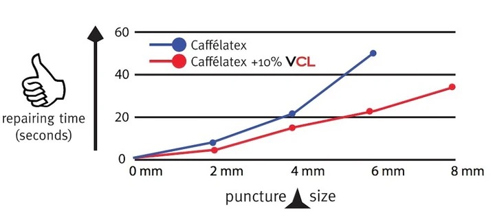 Wenn 10% V-CL (zum Beispiel 5 ml V-CL für 50 ml Caffélatex) direkt in einen Tubeless-Reifen mit Caffélatex gemischt werden, erhöht sich der maximal reparierbare Einstich von 4 - 5 mm auf 8 mm (und plus), mit kürzeren Reparaturzeiten und geringeren Druckverlusten. Längere Feldtests mit professionellen Teams haben gezeigt, dass V-CL einfach zu bedienen und sehr effektiv ist. Wir empfehlen V-CL für den Wettbewerb. Bei der Verwendung von Caffélatex in Kombination mit V-CL muss das Tubeless-Ventil häufiger gewartet werden.